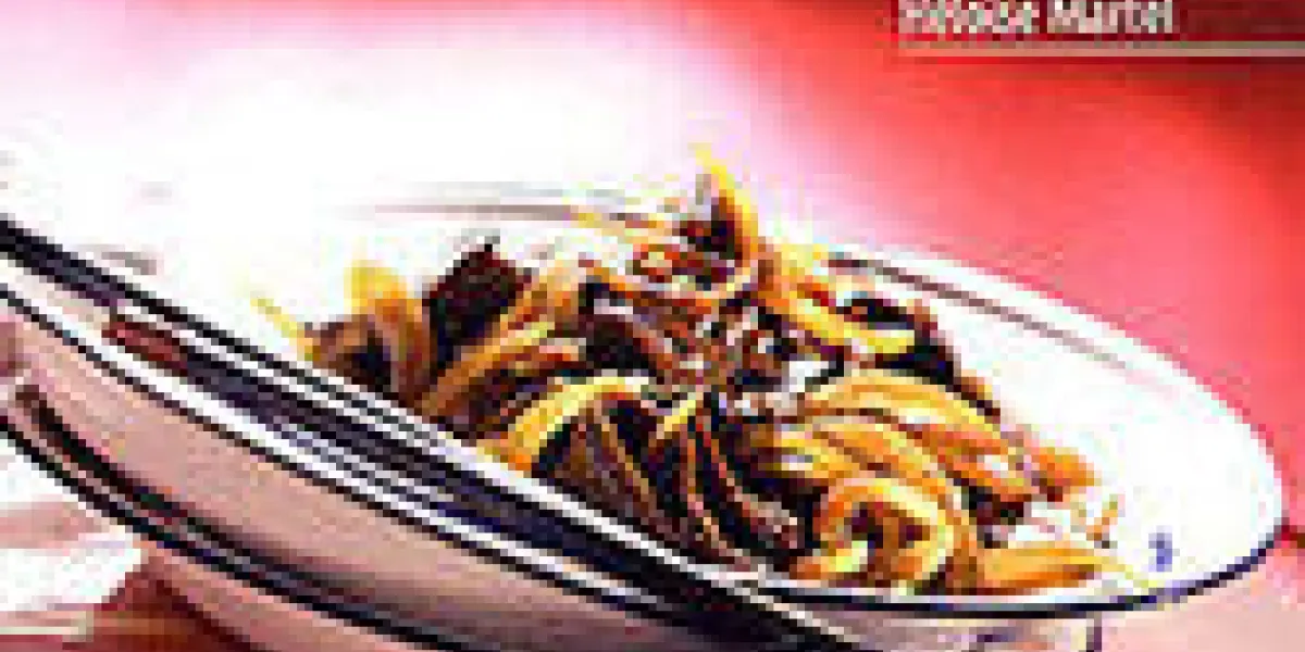 Retirez la viande, coupez-la en fines lamelles, réservez. Filtrez le bouillon, reversez-le dans le wok.
