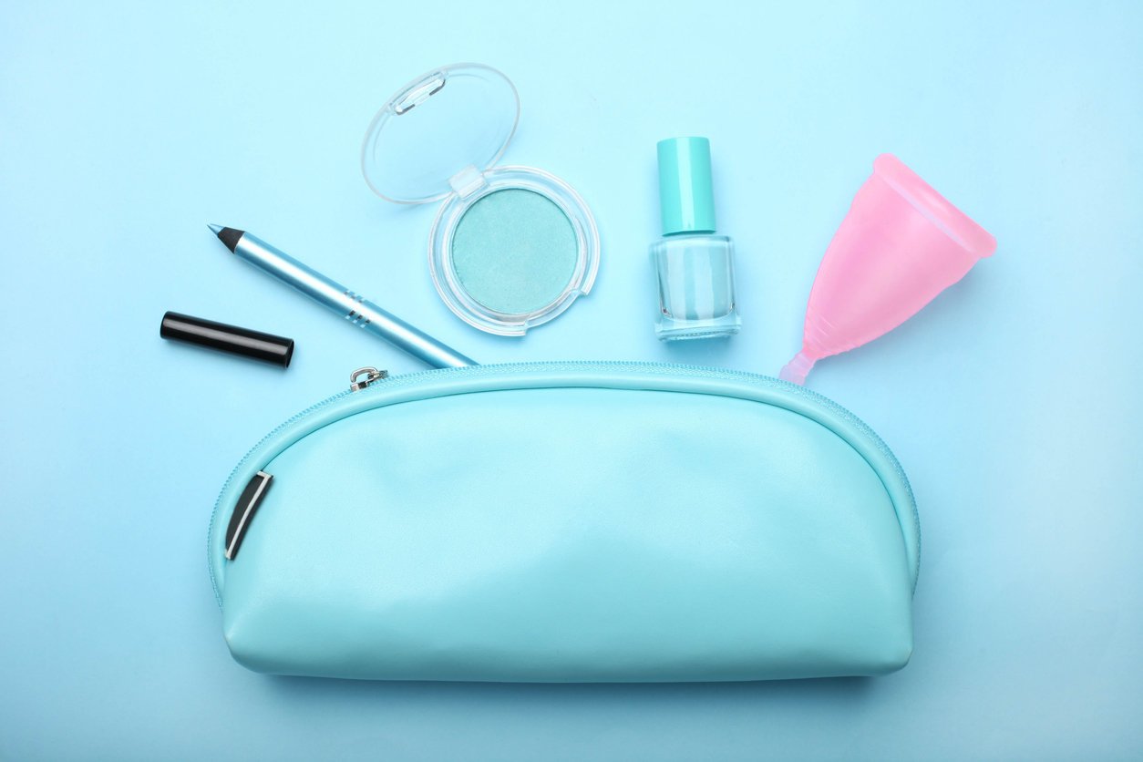 reusable silicone menstrual cup in female cosmetics bag on blue background concept of feminine hygiene, gynecology, health top view