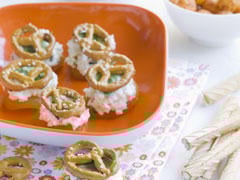 Déposez une noix de farce sur les abricots secs, redonnez un tour de moulin à poivre et déposez un bretzel sur le dessus au moment de servir