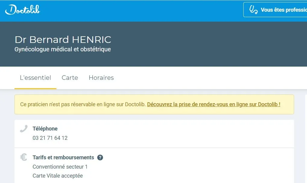 En 2015, la justice prononce une interdiction d’exercer en tant que gynécologue à l’encontre du Dr Henric. Pourtant, jusqu’en 2018, la plaque apposée à l’entrée du cabinet mentionnait toujours cette spécialité. En outre, aujourd’hui encore sur la plateforme Doctolib, le Dr Henric apparaît comme "Gynécologue médical et obstétrique".