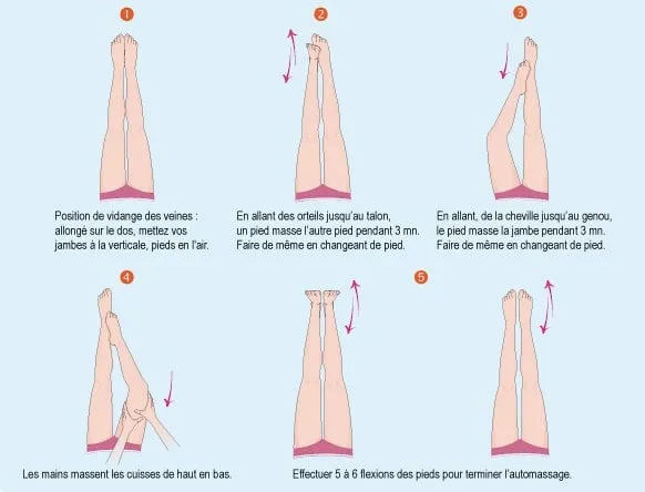 Une accumulation de toxines et d'eau dans les tissus peut provoquer une sensation de jambes lourdes. Dans cet auto-massage pieds et mains sont mis à contribution. Allongé, jambes surélevées, ce sont d’abord les pieds qui effectuent le massage de la partie basse des jambes (cf : techniques et explication sur la diapo). Puis les mains prennent le relais pour le haut des cuisses.