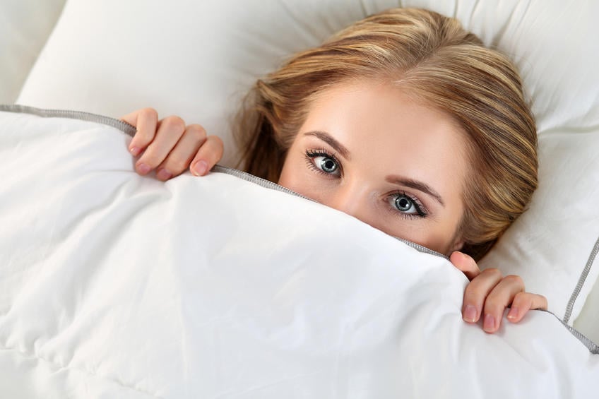 belle femme blonde se cachant le visage sous la couverture couché dans le lit yeux féminins étincelants à la recherche dans la caméra gros plan rêves, flirt, jeu, se réveille dans le lieu étrange, la honte, le concept de sexe décontracté