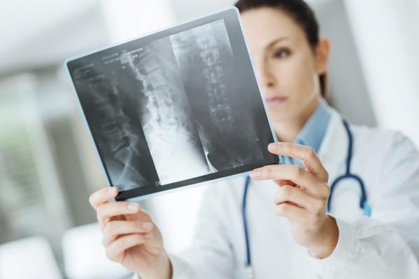jeune femme médecin examinant la radiographie de la colonne vertébrale d'un patient lors d'une visite