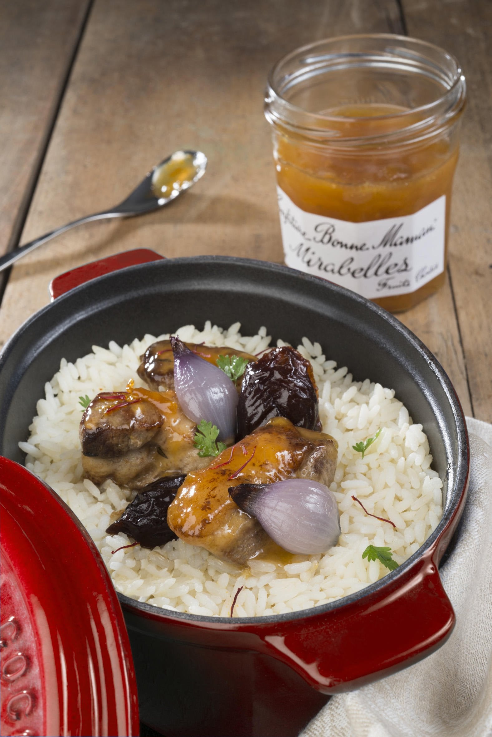 A l'aide d'un pinceau, laquer les morceaux de viande avec la Confiture de Mirabelles Bonne Maman® puis les positionner sur un lit de riz, entourés de pruneaux. Arroser de jus de cuisson.