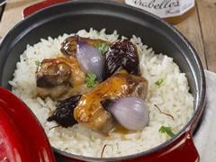 8- A l'aide d'un pinceau, laquer les morceaux de viande avec la confiture de mirabelles puis les positionner sur un lit de riz, entourés de pruneaux. Arroser de jus de cuisson.