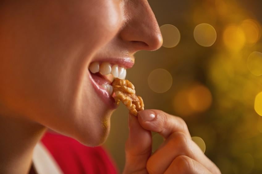 gros plan sur jeune femme au foyer, manger des noix