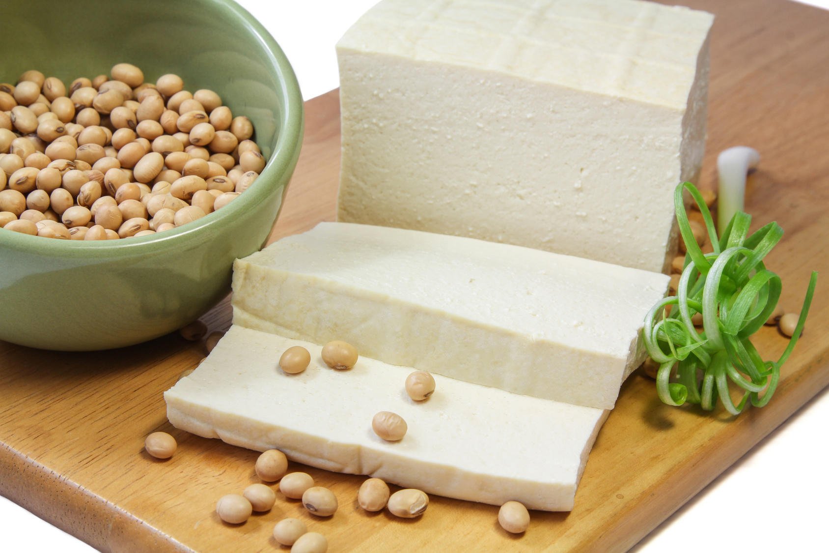 tofu et soja sur un billot avec de l'oignon vert