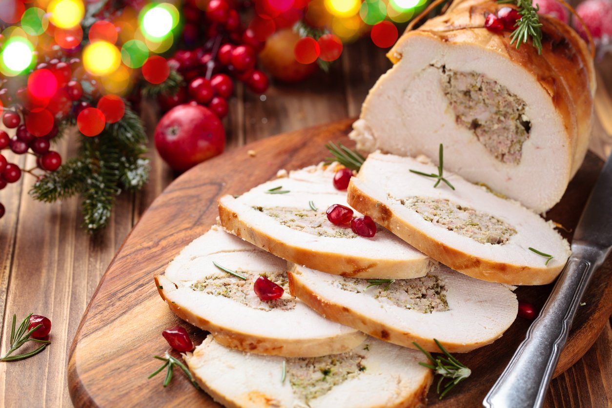 stuffed turkey breast with pomegranate and rosemary on cutting board