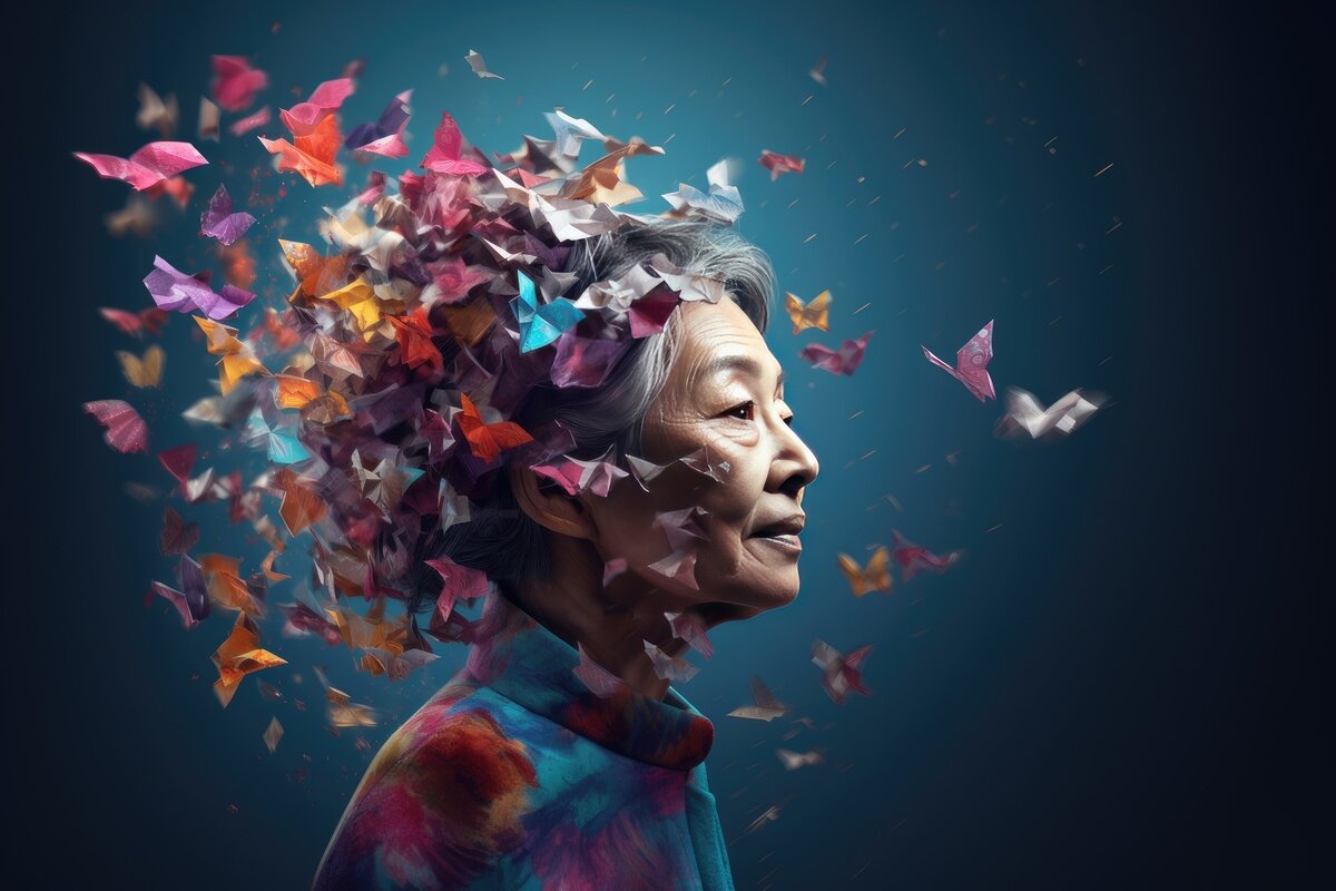 asian woman patient with alzheimers disease, exploding head, memory loss concept