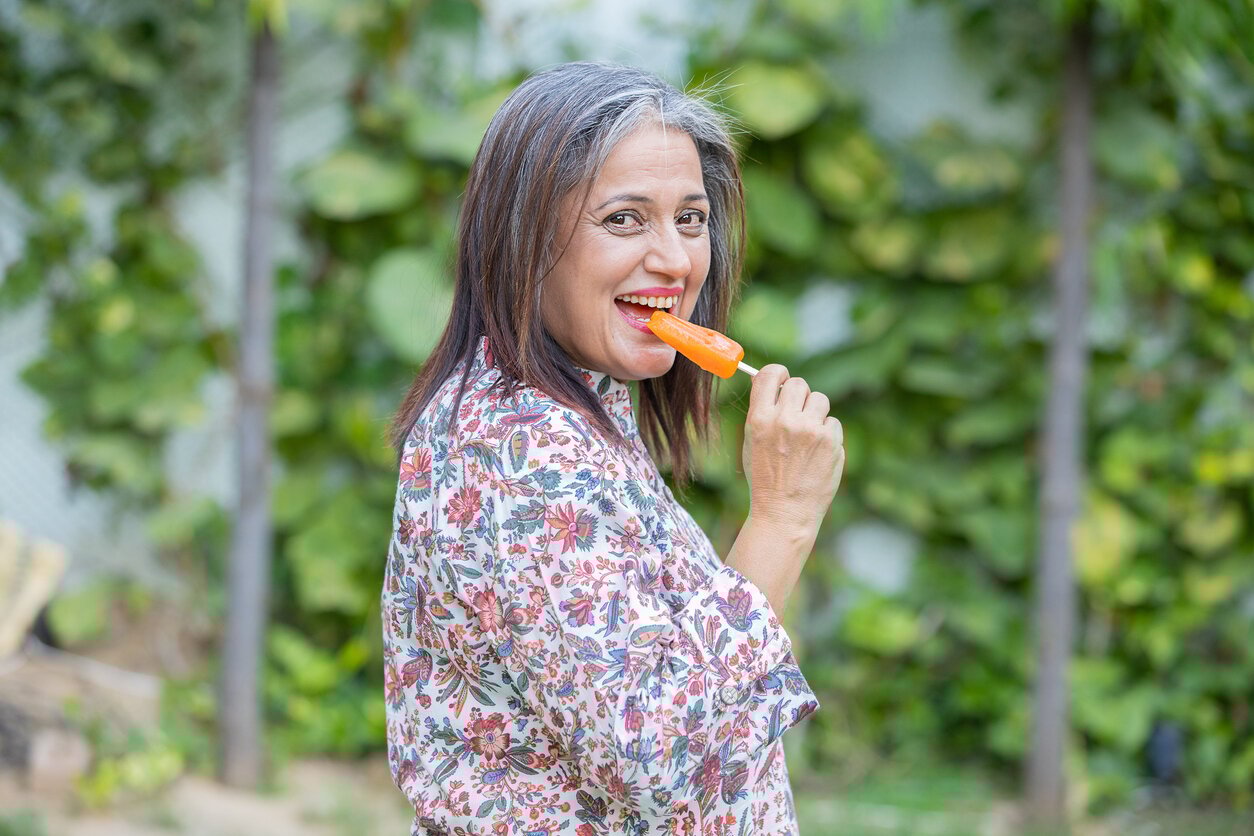 happy indian senior woman having ice lolly or ice cream together outdoor, old mature people enjoy retirement life summer holidays
