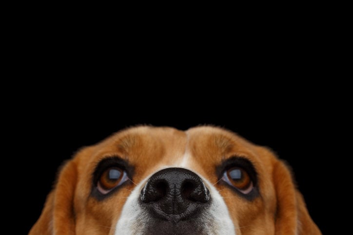 closeup portrait of beagle dog peeking nose isolated on black background in studio