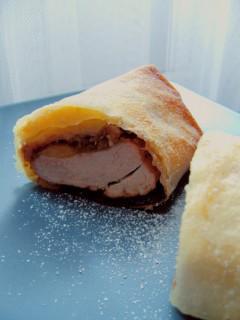 Rabattre le bord inférieur puis les côtés du feuilleté de brick vers le centre puis rouler délicatement vers le bord supérieur en serrant bien. Si nécessaire, faire tenir le strudel avec un cure-dent. Réaliser ainsi 4 strudels que vous badigeonnerez de beurre. Les glissez dans un four à 180°C durant 30 minutes. Servir le tout saupoudré de sucre glace.