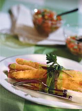 Rouler chaque asperge dans de la farine, les passer ensuite dans un jaune d'oeuf détendu à l'eau. Enfin, les rouler à nouveau mais cette fois-ci dans de la chapelure de pain. Tapoter pour en faire tomber l'excédant. Faire cuire rapidement (1 à 2 minutes) à l'huile frémissante.