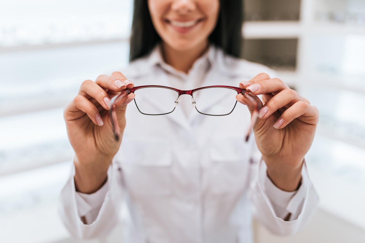 cropped image of attractive young female doctor in ophthalmology clinic doctor ophthalmologist is standing near shelves with different eyeglasses