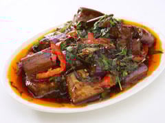2. Laver, sectionner avec un couteau la partie du haut, vers les sépales. Éplucher avec un économe. Couper en cubes. Aubergines aux oignons à la chinoise