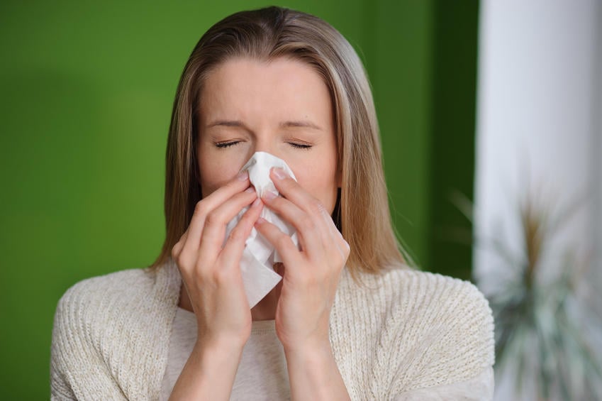 femme soufflant nez qui coule - maladie de la grippe froide - fond vert
