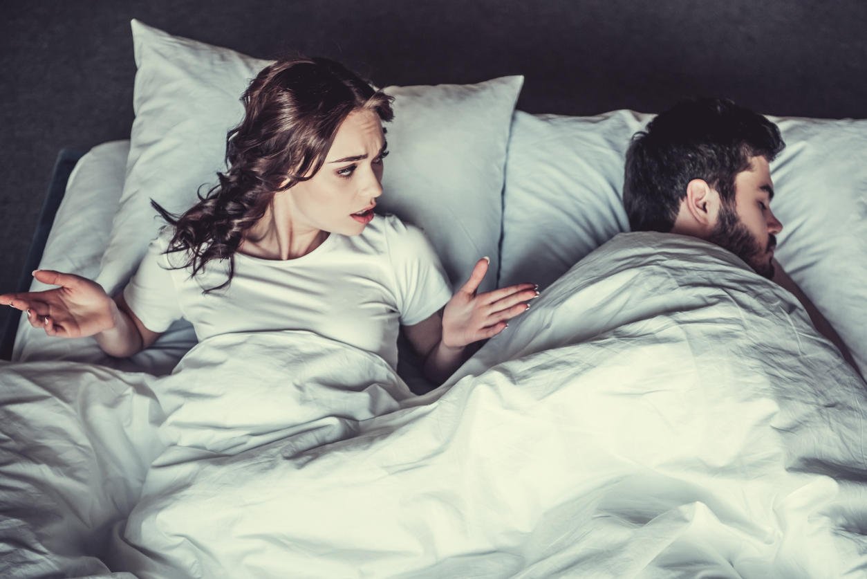 dissatisfied young girl and her boyfriend sleeping in bed