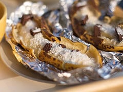 Fendre les bananes en deux dans le sens de la longueur, sans les peler et sans véritablement les diviser en deux. Saupoudrer d'une pincée de cassonade et insérer une barre de chocolat noir dans l'entaille de chaque banane. Enrouler les bananes, hermétiquement, dans du papier aluminium. Glisser les bananes en papillote dans des braises chaudes et laisser cuire 15 à 20 minutes jusqu'à ce que le chocolat soit fondu et la chair de la banane ramollie. Retirer les papillotes des braises, les ouvrir. Retirer les peaux de banane et servir aussitôt !
