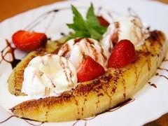 6. Peler les bananes et les poser sur quatre carrés d’aluminium, puis ajouter les quartiers d’orange.