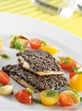 Etaler la pâte obtenue sur le dessus des filets de poisson, assaisonner et cuire les filets à la plancha très délicatement.