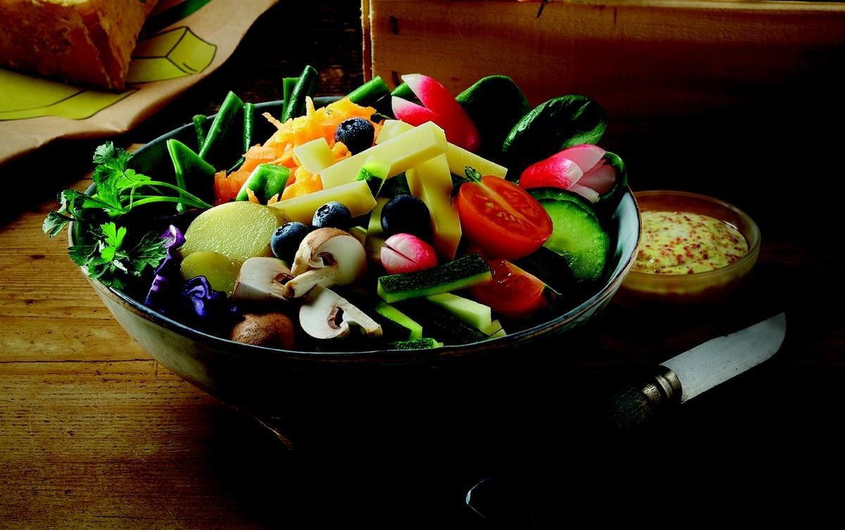 - 200 g de chaque : pousse d’épinard, concombre, carotte, haricot vert, champignon, chou rouge, tomate, courgette et myrtille