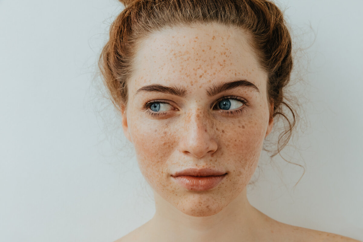calm and pretty close-up beautiful blue eyed girl with freckles is looking away, on a white background