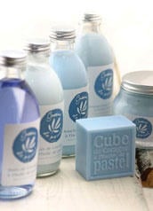 La société "Cocagne et compagnie" a développé une gamme "graine de pastel" en 2003. La texture nacrée ou transparente des crèmes et huiles, la couleur forcément naturelle des savons, l'odeur de plante fraîchement coupée participent au sentiment de plaisir et de relaxation d'une crème hydratante. Le bleu n'apaise pas que nos peaux !