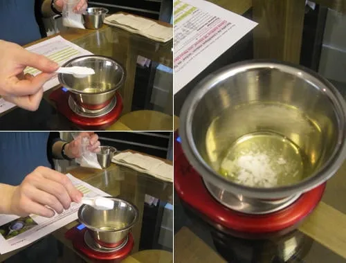 Dans le même bol, ajouter la cire émulsifiante (1,6g ou 1,5 pelles de 2ml), qui va servir à « épaissir » votre préparation.