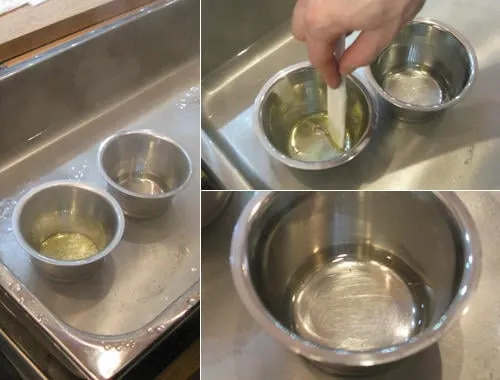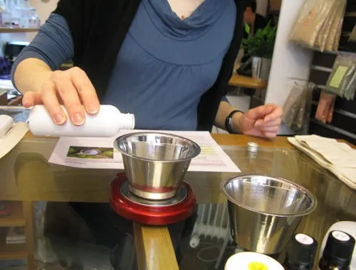 Une fois tous les ingrédients mesurés, placez les deux bols côte à côte au bain-marie. A l’aide d’une petite spatule, mélangez la cire pendant qu’elle fond, avec l’huile de bourrache, jusqu’à ce que le mélange soit bien homogène. Quand les deux préparations sont à la même température – 70°C – vous pouvez les retirer du bain-marie (si vous n’avez pas de thermomètre, attendez l’apparition de petites bulles au fond du bol).