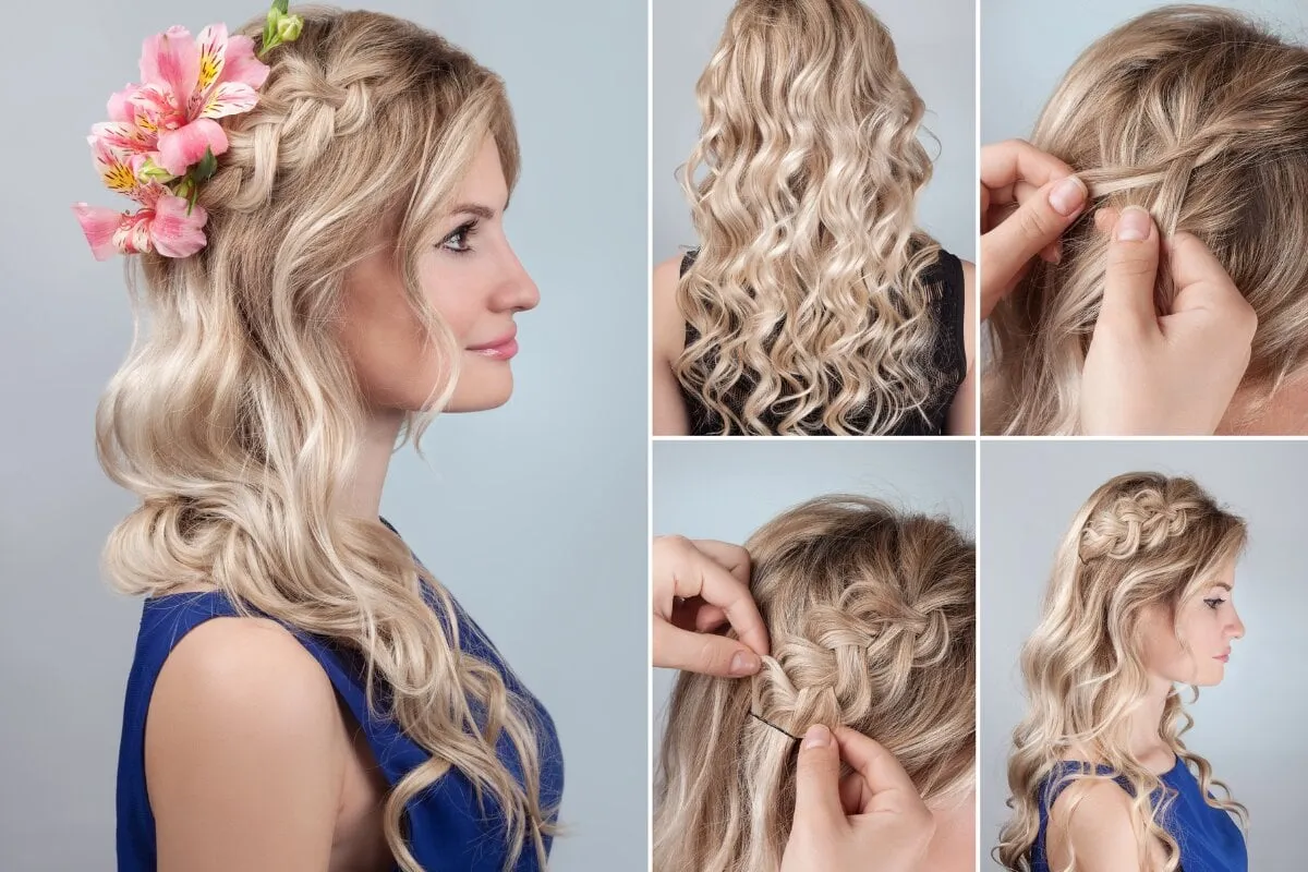 Matériel nécessaire : Brosse à cheveux, fer à boucler, élastiques fins, laque pour cheveux, épingles à cheveux, et quelques fleurs fraîches ou artificielles.