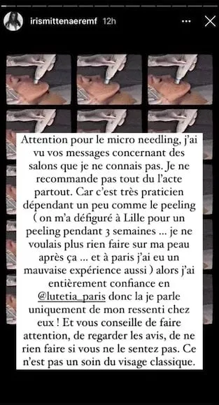 "Pour le micro needling, j’ai vu vos messages concernant des salons que je ne connais pas. Je ne recommande pas du tout l’acte partout. Car c’est très praticien dépendant un peu comme le peeling (on m’a défigurée à Lille pour un peeling pendant 3 semaines… je ne voulais plus rien faire sur ma peau après ça… et à Paris, j’ai eu une mauvaise expérience aussi)" a détaillé Iris.