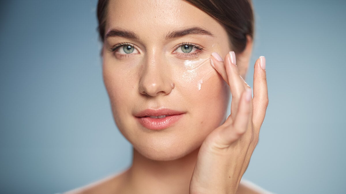 portrait of a young woman applying cosmetic product under her eyes on a gray background