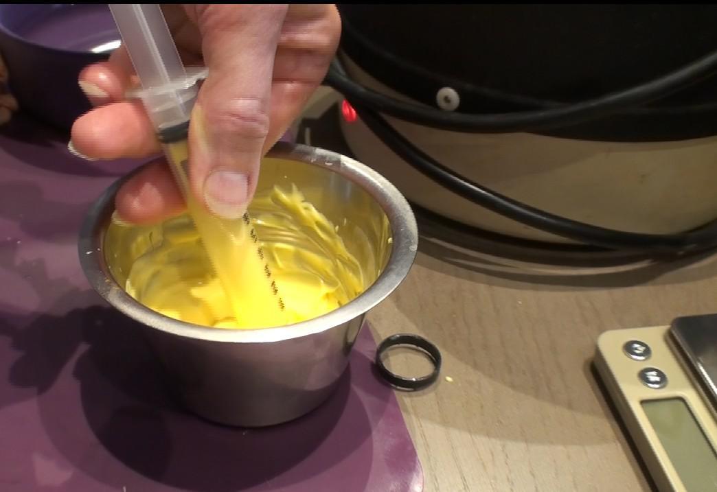 - Etape 6 : Ajouter à la préparation 1,2g d'extrait de bourgeons de hêtre, 0,9g d'huile végétale de Buriti, 2 gouttes d'huile essentielle de basilic sacré, 1 goutte d'huile essentielle de curcuma, 22 gouttes de fragrance cosmétique "Trésor ambré" et 13 gouttes de conservateur Cosgard.