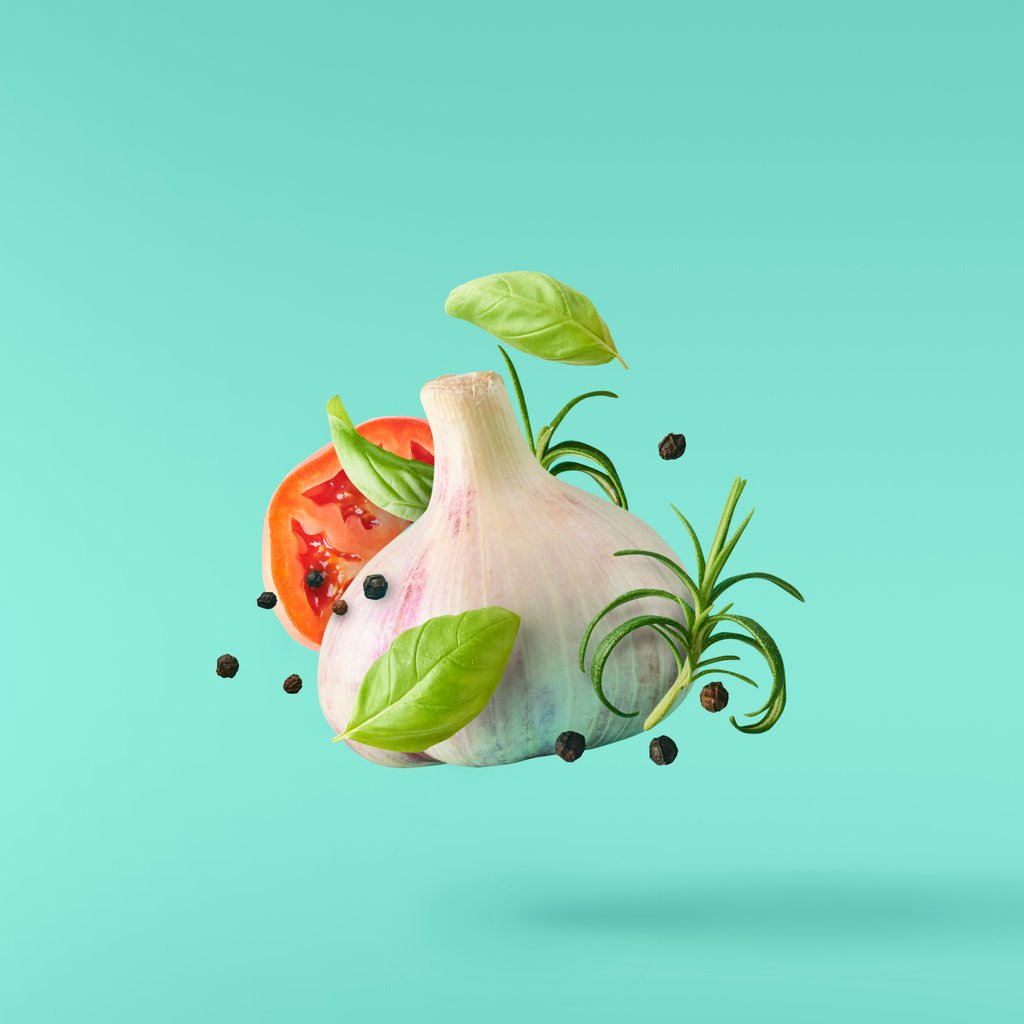 garlic falling in air with pepper and herbs like rosemary and basil leaves on turquoise background spicy food concept