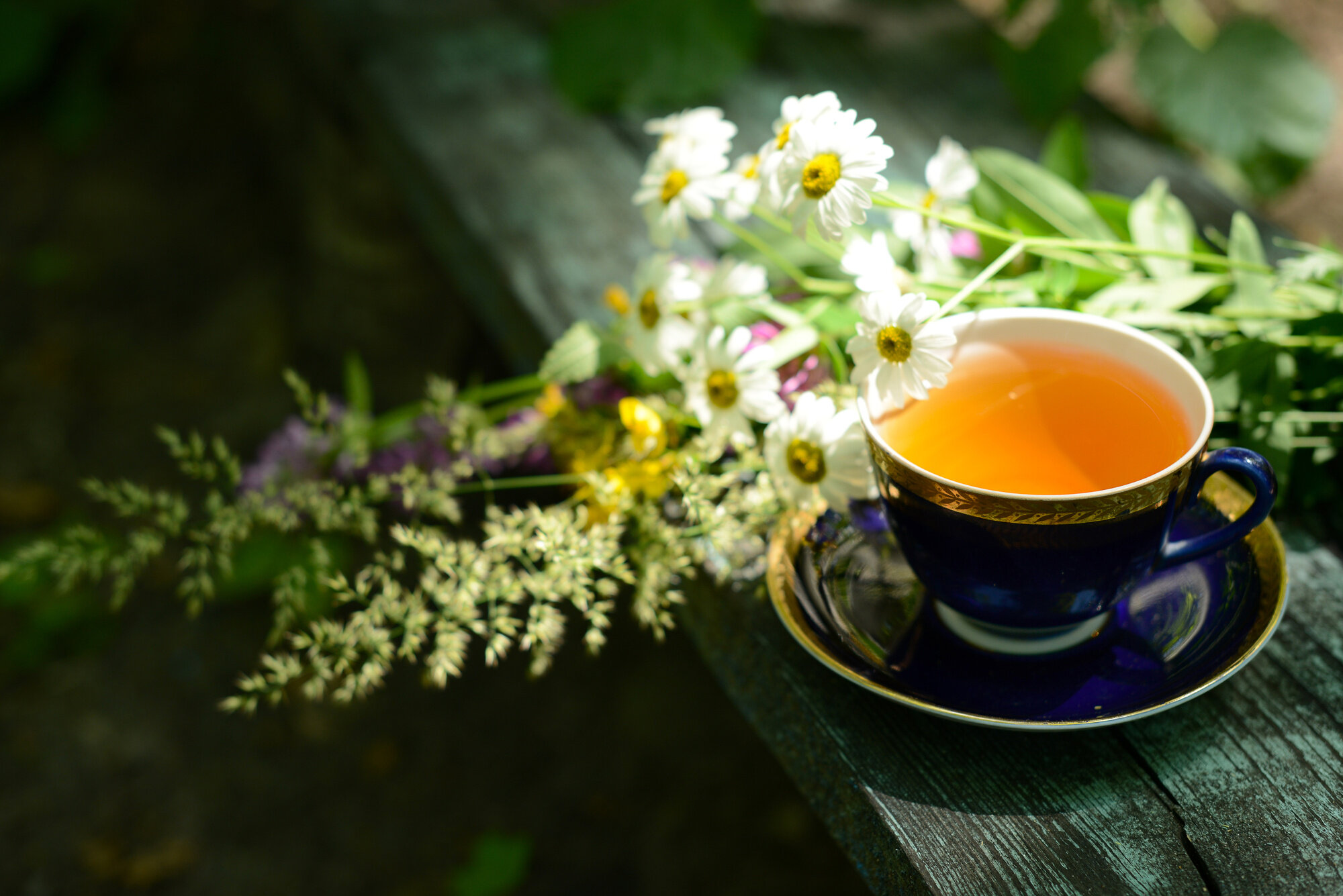 herbal tea, cup of tea and bouquet chamomile flowers and wildflowers on wooden table in garden, blurred background, soft focus