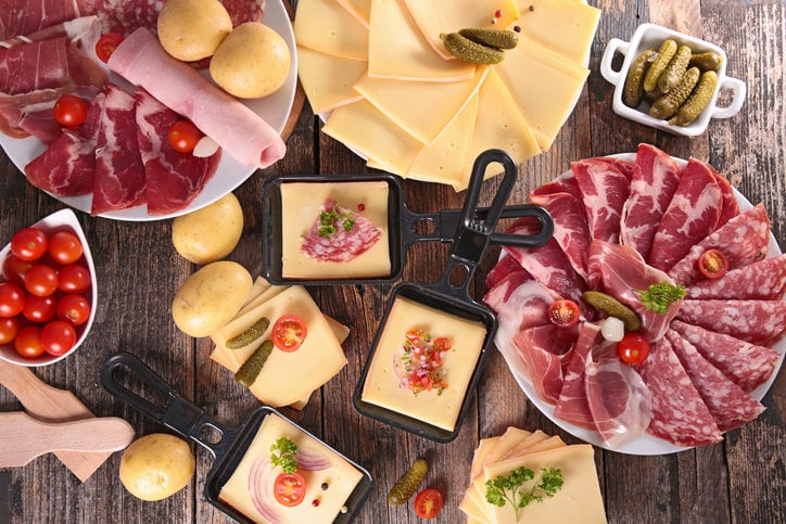 - La raclette : pour cette autre spécialité des montagnes alpines, il faut faire fondre du fromage à raclette dans un poêlon et à le laisser couler, une fois fondu, sur une pomme de terre et de la charcuterie.