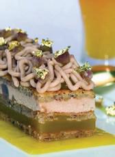 Montage et finitions : Couper le biscuit dans la largeur pour obtenir 3 rectangles égaux. Sur le 1er, étaler la moitié du sirop de mandarine. Sur le 2ème, étaler 1/3 de la crème de marron. Poser le 2ème rectangle sur le 1er. Ajouter le 3ème. Réserver 2 h au frais. Détailler des barres de 3x12 cm. Avec une poche, tracer un trait de compotée de mandarines au centre des barres. Garnir une 2ème poche à douille de crème de marron, tracer des "vermicelles" sur toute la surface du "russe". Décorer avec des brisures de marrons et quelques éclats de feuilles d'or.