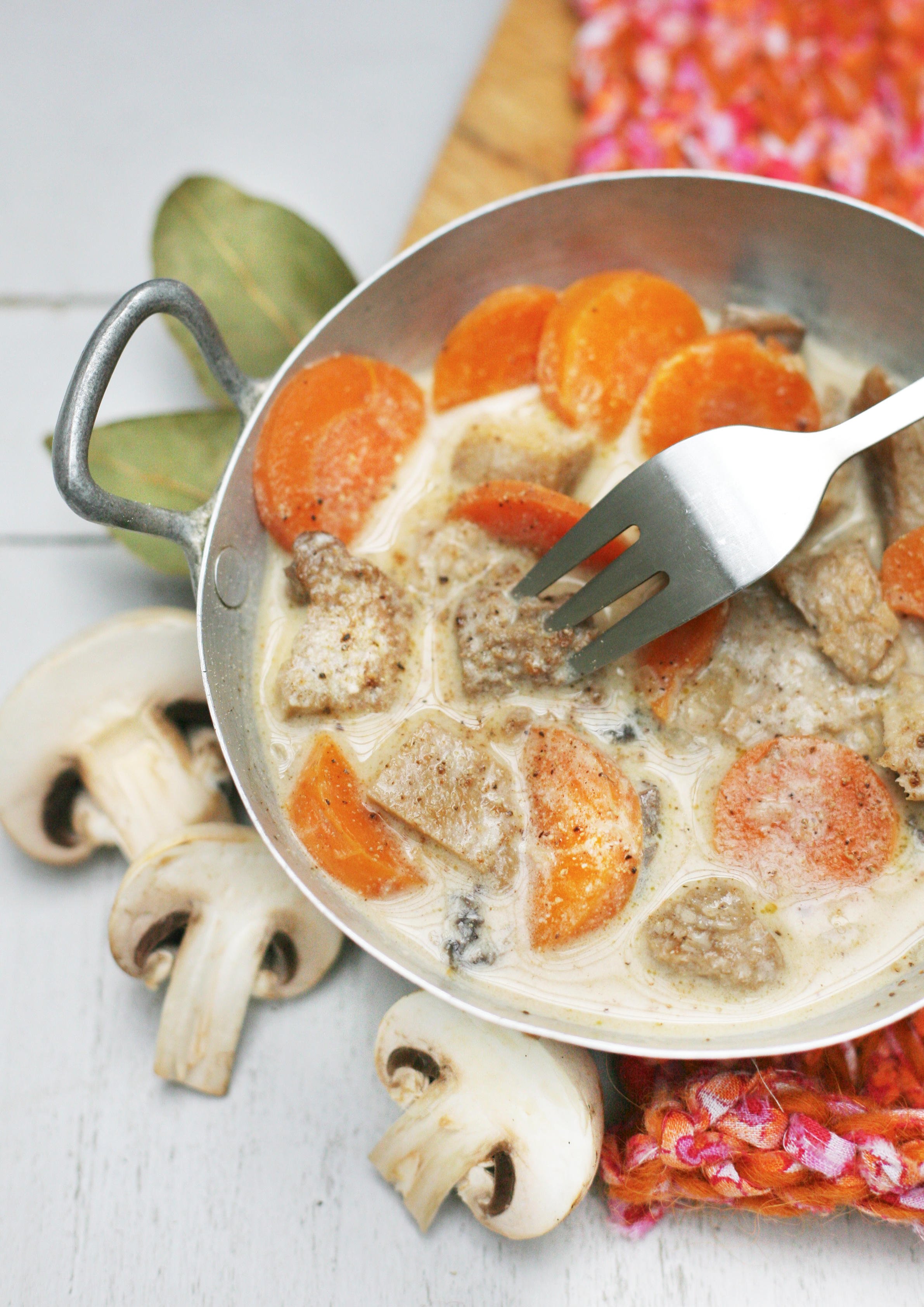4- Goûter pour rectifier le sel, ajouter éventuellement du poivre. Terminer en délayant la purée de cajou dans la blanquette, pour l’onctuosité.
