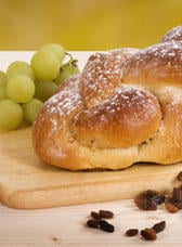 100g de raisins secs, 1 cuillerée à soupe de levure de boulanger, 1 cuillerée à soupe de jus de citron, 25 cl de l'eau tiède, 110g de beurre, 100g de sucre glace, 3 œufs, 1/2 cuillerée à café de arôme vanille, zeste de citron, un peu de sel, 420g de farine, 30 cl de lait