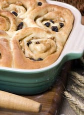 475 g de farine blanche, 850 ml de lait, 2 œufs entiers battus, 5 jaunes d'œufs, 100 g de beurre fondu, 200 g de sucre, 1 bonne pincée de sel, 1/2 carré de levure boulangère, raisins secs pour décorer, 1 un sachet de sucre vanillé