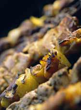 Enfiler les morceaux de viande sur des brochettes et les faire griller quelques minutes sur chaque face.