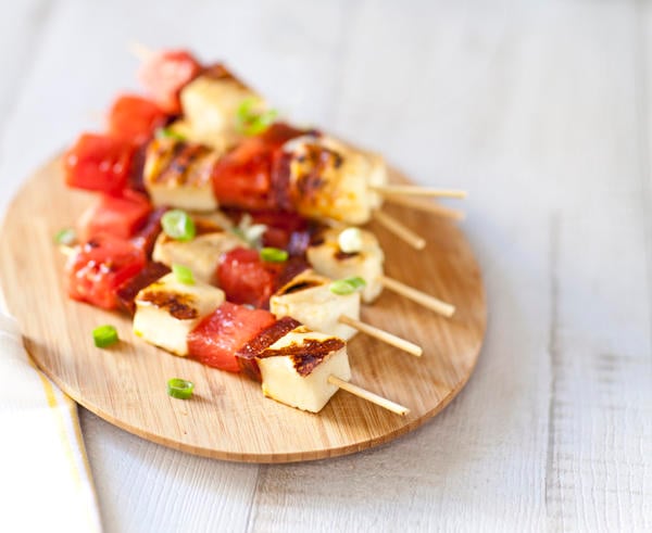 Sur des batons de brochette, enfilez alternativement un cube de Grillis, une demi- rondelle de chorizo et un cube de pastèque, renouvelez l’opération une fois.