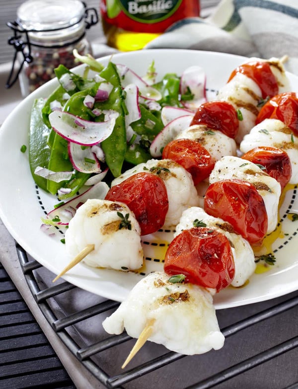 Pendant ce temps, égouttez pois gourmands et radis, ciselez finement l’oignon rouge et mélangez délicatement le tout. Assaisonnez d’un filet de vinaigrette légère biphasée Puget fines herbes. Accompagnez vos brochettes parsemées de fleur de sel, de cette salade aussi fraîche que croquante et colorée.