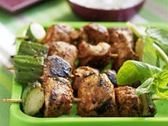 Enfoncer le poulet sur des pics en bois et faire cuire les brochettes dans une grande poêle antiadhésive ou au barbecue pendant 10 minutes, en les retournant régulièrement.