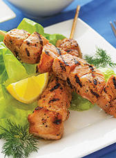 Enfiler les cubes sur vos piques pour obtenir 8 brochettes en alternant les cubes de saumon et les quartiers de courgettes.