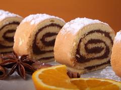 3- Fourrer la bûche avec un tiers de ganache. Disposer dessus des griottes dénoyautées, des tranches d’oranges confites, des brisures de meringue ou de marrons glacés... au choix.