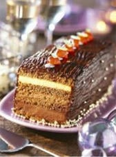 * Masquer entièrement la bûche avec la ganache au chocolat et la strier avec les dents d'une fourchette. Mettre 2 heures au réfrigérateur.
