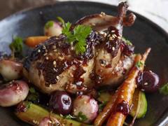 Cailles laquées à la confiture de cerises noires et petits légumes rôtis