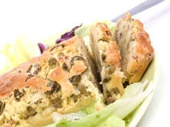 Farinez les olives. Mélangez dans une terrine la farine, la levure et les œufs battus avec du sel et du poivre. Ajoutez l'huile, le lait, puis lorsque le mélange est homogène, incorporez les olives, le thym et le romarin effeuillés.