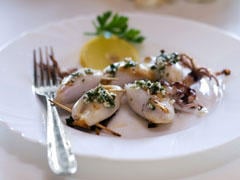Couper la tête des calamars et leurs tentacules. Retirer la pellicule qui recouvre les poches et le cartilage à l'intérieur. Nettoyer les tentacules.